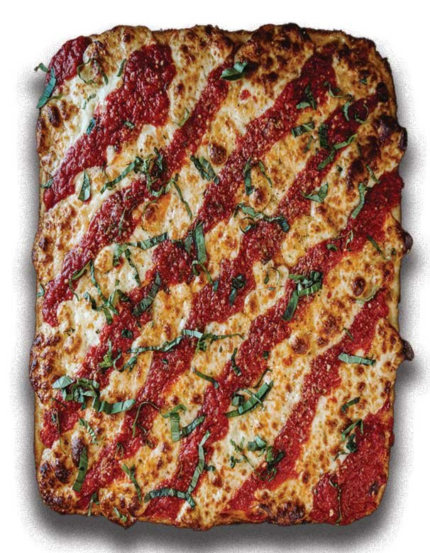 Thin Sicilian pizza topped with mozzarella cheese and a red tomato sauce on top of the cheese + Fresh Basil ,cut into 8 slices