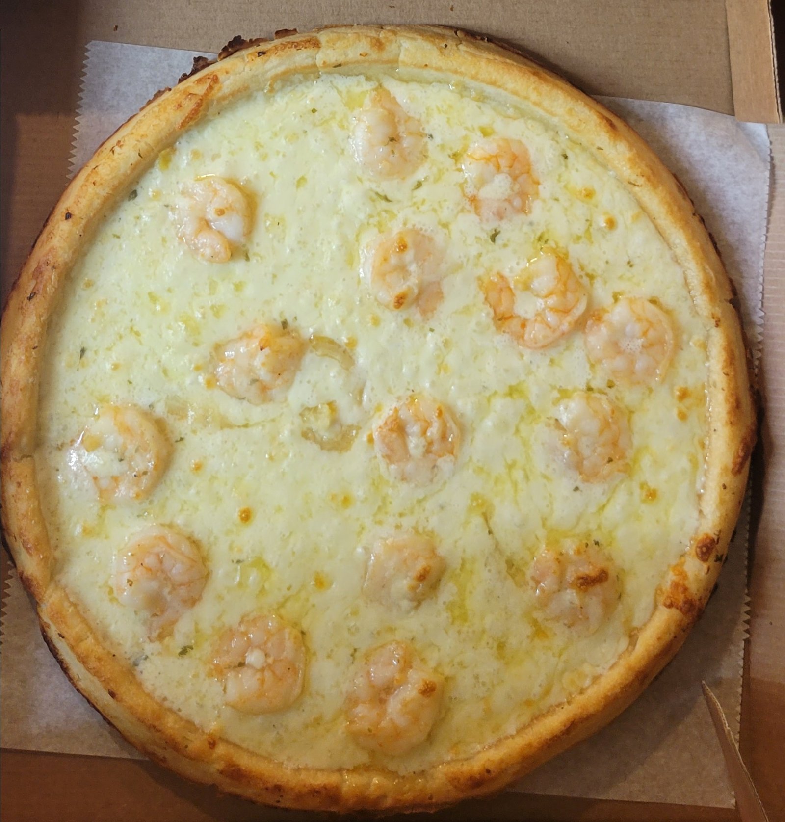 A touch of dry white wine is added to intensify the savory flavors, giving the pizza a subtle, refined finish that echoes traditional Italian seafood dishes. To tie it all together, we layer melted mozzarella cheese, creating a golden, bubbly, and gooey topping that perfectly complements the buttery, garlicky shrimp. Each slice delivers a combination of textures and flavors — from the crisp, golden crust to the creamy sauce and tender shrimp — making every bite a memorable experience.